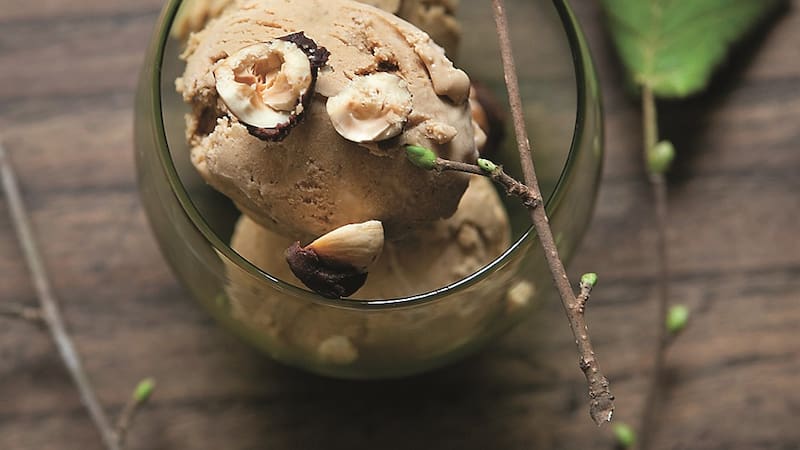 5. Retirar del freezer y colocar en la procesadora; procesar hasta que esté suave, volver el helado al bol y congelar en el freezer nuevamente hasta que esté solido. Este helado también se puede preparar en la máquina para hacer helados siguiendo las instrucciones del fabricante. Servir el helado decorado con avellanas tostadas.