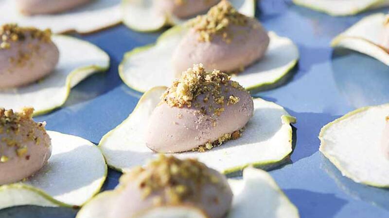 3. En una fuente de servir colocar las láminas de manzanas y encima distribuir los quenelles de paté. Espolvorear con pistachos y servir de inmediato.