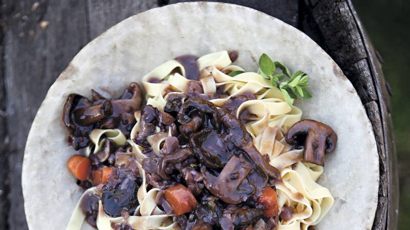 3. Verter el caldo de verduras y vino tinto, llevar a ebullición 3 minutos, agregar el orégano, pasta de tomate, sazonar con sal y pimienta. Reducir el fuego a bajo, tapar y cocinar 20 minutos.
