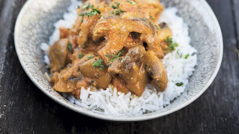 1. En un sartén calentar el aceite a fuego medio, agregar la cebolla y ajo y cocinar 2 minutos, añadir el tomate y cocinar hasta que la cebolla esté transparente, añadir la páprika, azafrán, comino, semillas de cilantro, jengibre y cocinar 1 minuto. Incorporar los champiñones, seguir cocinando 1 minuto más y agregar la pasta de tomates. Verter 30 ml de agua, bajar el fuego a bajo y cocinar 5 minutos, revolviendo de vez en cuando hasta que los champiñones estén cocidos. Luego añadir el yogurt, crema y sazonar con sal y pimienta; cocinar 2 minutos más. Retirar del fuego y espolvorear el cilantro fresco. Servir acompañado con arroz basmati.
