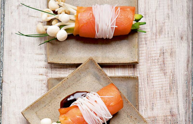1. Sobre una superficie lisa extender 12 láminas de salmón y distribuir sobre cada una 1 palta en bastones, 150 g de hongos enoki, ramas de ciboulette y ¼ taza de maní, enrollar formando cilindros con las verduras sobresaliendo por un extremo. Remojar 50 g de vermicelli (fideos de arroz) en agua caliente, 5 minutos, y estilar. Enrollar los vermicelli al centro de los