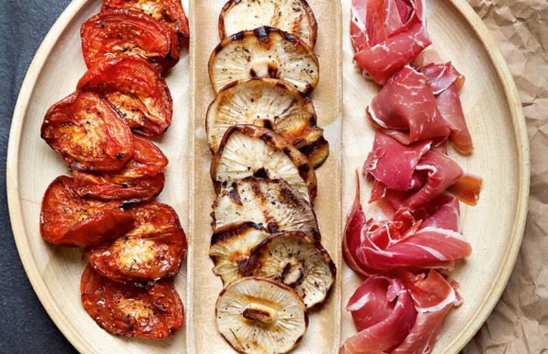 2. En un bol grande mezclar 1/4 taza (60 ml) aceite de oliva, 1/4 taza (60 ml) de jugo de limón, 1 cucharadita de orégano seco y pimienta a gusto. Agregar 300 g de hongos shiitake, revolver y dejar marinar, 15 minutos. Sobre la parrilla encendida a fuego medio colocar los hongos reservando el líquido de la marinada. Cocinar 11/2 minutos por lado o hasta que estén tiernos, sazonar con sal, retirar de la parrilla y colocar en una fuente para servir, rociar con el líquido de la marinada reservado y acompañar con los tomates asados reservados y láminas de jamón crudo para acompañar. Servir caliente o frío.