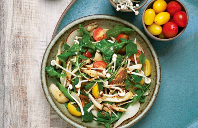 3. En un sartén calentar 2 cucharadas de aceite de oliva, agregar los 150 g de hongos eryngii en láminas a lo largo y saltear hasta dorar ligeramente. Transferirlos a la ensalada reservada, mezclar y distribuir en platos individuales, rociar con el aliño reservado y servir de inmediato. (Para 4 personas).
