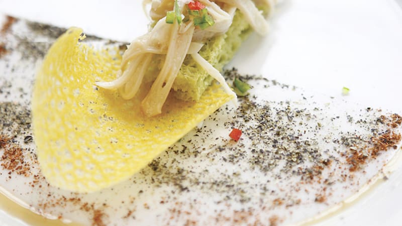 Huepos en dressing de papaya sobre esponja de espirulina y tierra de algas chilotas