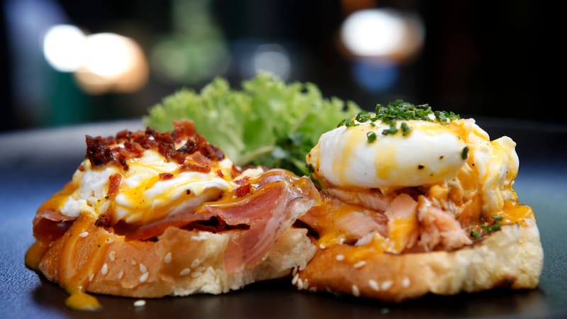 Huevos Benedictinos con salmón y prosciutto, en salsa holandesa