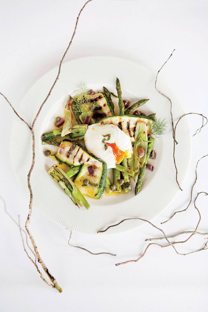 Huevo pochado sobre verduras grilladas con vinagreta de anchoa, alcaparras y aceitunas