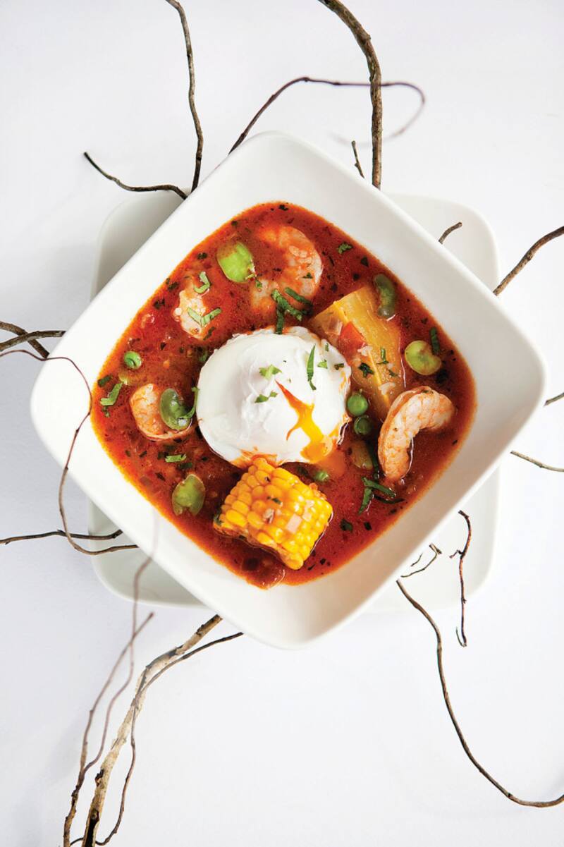 Chupe de camarones al estilo peruano con huevo pochado