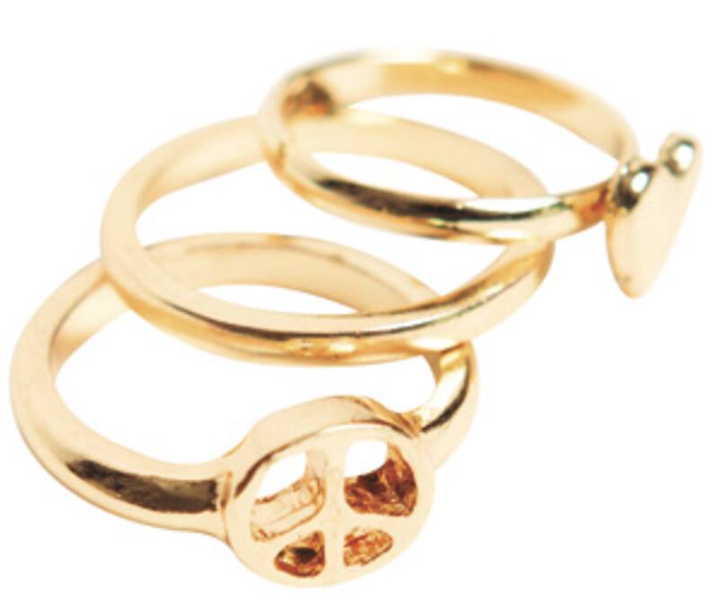 Argollas lisas, con corazones y con el signo paz en plateado y dorado venden en esta tienda de bisutería. Tienen varias medidas para que se ajusten al dedo y a la altura que se quiera usar. $1.000. Patronato 234.