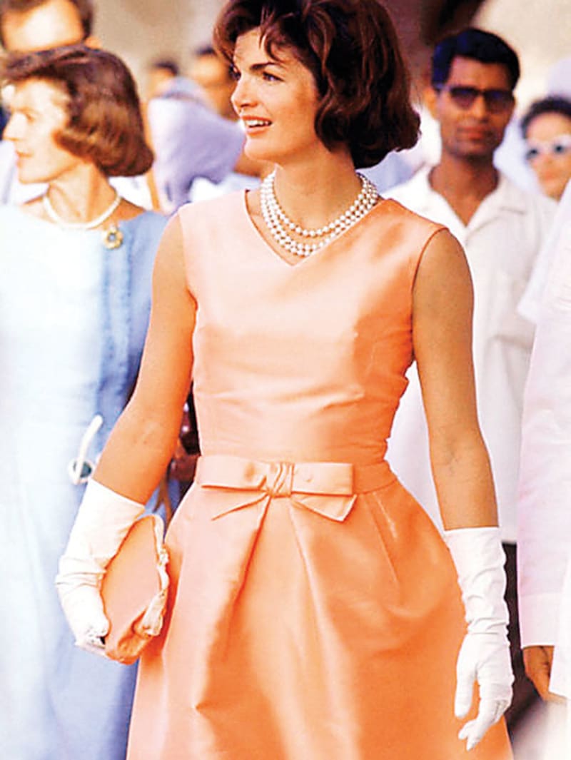 Clóset diplomático: en actividades oficiales, Jackie usaba trajes de cortes sencillos y colores sólidos. En galas y celebraciones nocturnas se atrevía a mostrar los hombros y lucir colores inesperados, como el rosa, o combinaciones audaces como negro, amarillo y blanco. No le importaba repetir un vestido y las joyas de su colección personal siempre eran discretas. Durante los viajes presidenciales manejó su clóset de manera impecable. En su visita a India optó por el recato con un vestido de seda zibeline color damasco (foto) que se convirtió en un clásico. En una visita a Francia usó solo trajes de Cassini hasta que en la gala del Palacio de Versalles optó por un modelo de Givenchy, honrando a los franceses a través de su cultura de moda. Lo mismo en España, donde se le vio con mantillas y sombreros tipo "bolero". Cassini aseguraba que el estilo diplomático de Jackie era una extensión natural de su capacidad para hacer siempre lo correcto en el momento correcto. Su estrategia ha sido replicada por incontables mujeres de alto perfil como la duquesa de Cambridge y Michelle Obama.