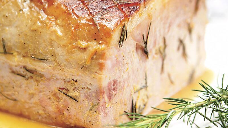 2. Forrar una lata de horno con papel aluminio. Secar bien el jamón con papel absorbente y colocarlo sobre la lata. Con un cuchillo hacer cortes en forma de diamantes sobre el jamón. Luego pincelar con ½ taza de la mezcla anterior reservada y espolvorear encima el romero. Tapar con papel aluminio y hornear 2 horas. Retirar el jamón del horno y eliminar el papel aluminio. Subir el horno a temperatura media-alta y pincelar con más mezcla de mermelada reservada. Volver el jamón al horno, hornear 20 minutos más o hasta dorar e ir pincelando con el resto de la mezcla de vez en cuando. Retirar del horno y dejar enfriar. Se puede hacer el día anterior y guardarlo en el refrigerador.