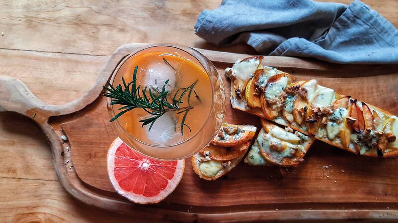 Espumante con pomelo y romero, acompañado de baguette con membrillos y nueces gratinado con queso azul