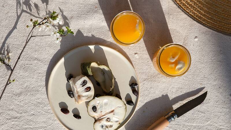 1. Poner en un jarro todos los ingredientes, si fuera necesario añadir agua filtrada o un poco de azúcar de caña integral. La idea es tomar el jugo y comerse las chirimoyas con una cuchara.