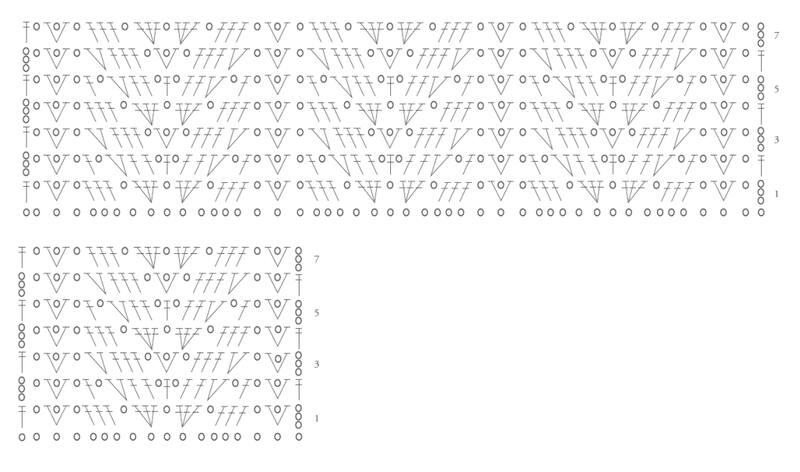 - Tejer según el diagrama 2 rectángulos (uno de cada color) de 30 cm de ancho x 103 cm de largo.