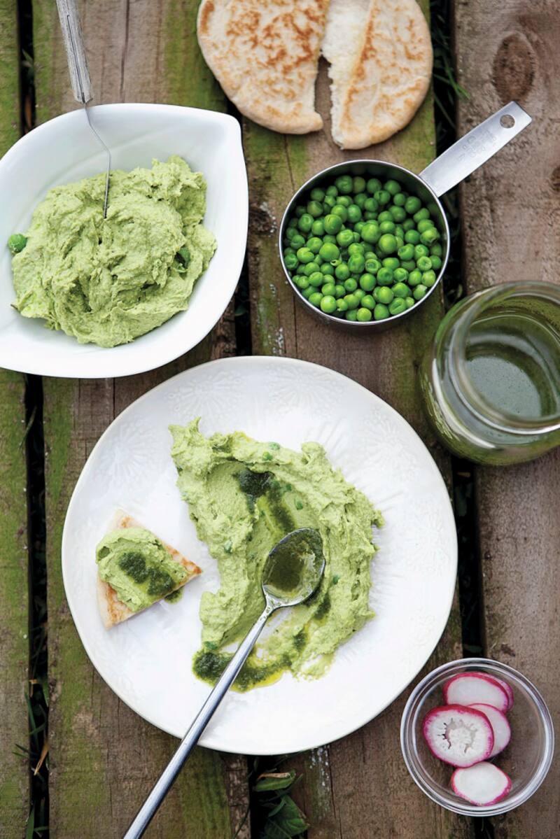 4. En un pocillo colocar el hummus de arvejas, rociar encima el pesto de hierbas y acompañar con las tostadas de pan pita.