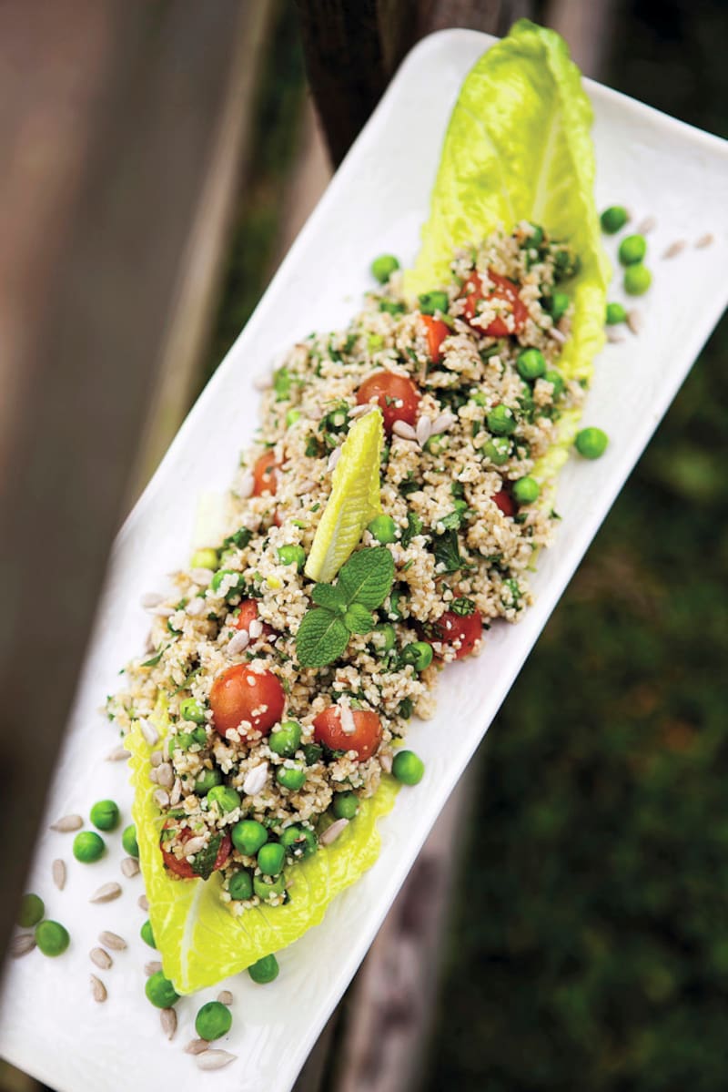 El bulgur es un producto elaborado a partir del trigo que ha sido parcialmente cocido, deshidratado y luego molido. Este cereal es común en la cocina del Medio Oriente, del sur de Asia y de Europa. Puede cocinarse rápidamente con agua hirviendo, y es un ingrediente apreciado para las ensaladas. En nuestra versión se agrega arvejas cocidas en vez de las habituales garbanzos, un aporte de color y frescura.