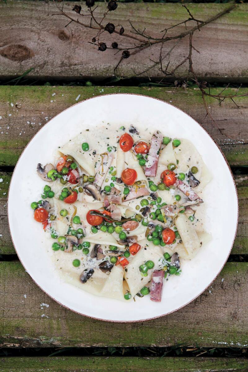 Pappardelle con arvejas, jamón, champiñones y salsa liviana de estragón y parmesano (para 4 personas)