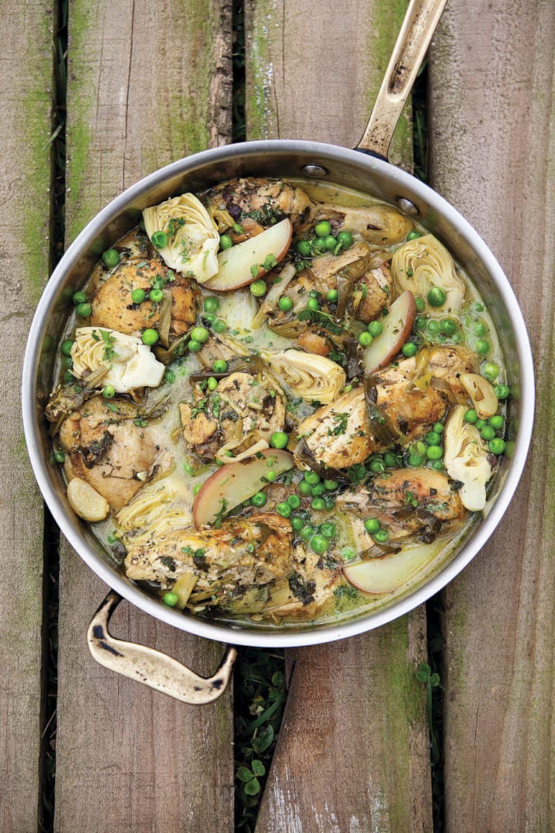 Ragú primavera de pollo con arvejas, papas nuevas, alcachofas y hierbas frescas (para 4-6 personas)