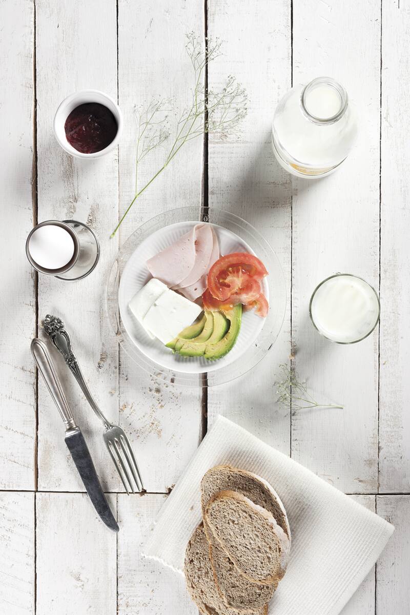 Un lácteo descremado con cereal sin azúcar (pueden ser 2 rebanadas de pan integral o un pan pita integral o cereales integrales). Si es pan, puede acompañarse de un huevo cocido o revuelto, sin aceite; o tres cm de quesillo; o una tajada de jamón de pavo; o ¼ de palta; o un tomate; o dos cucharaditas de mermelada sin azúcar.