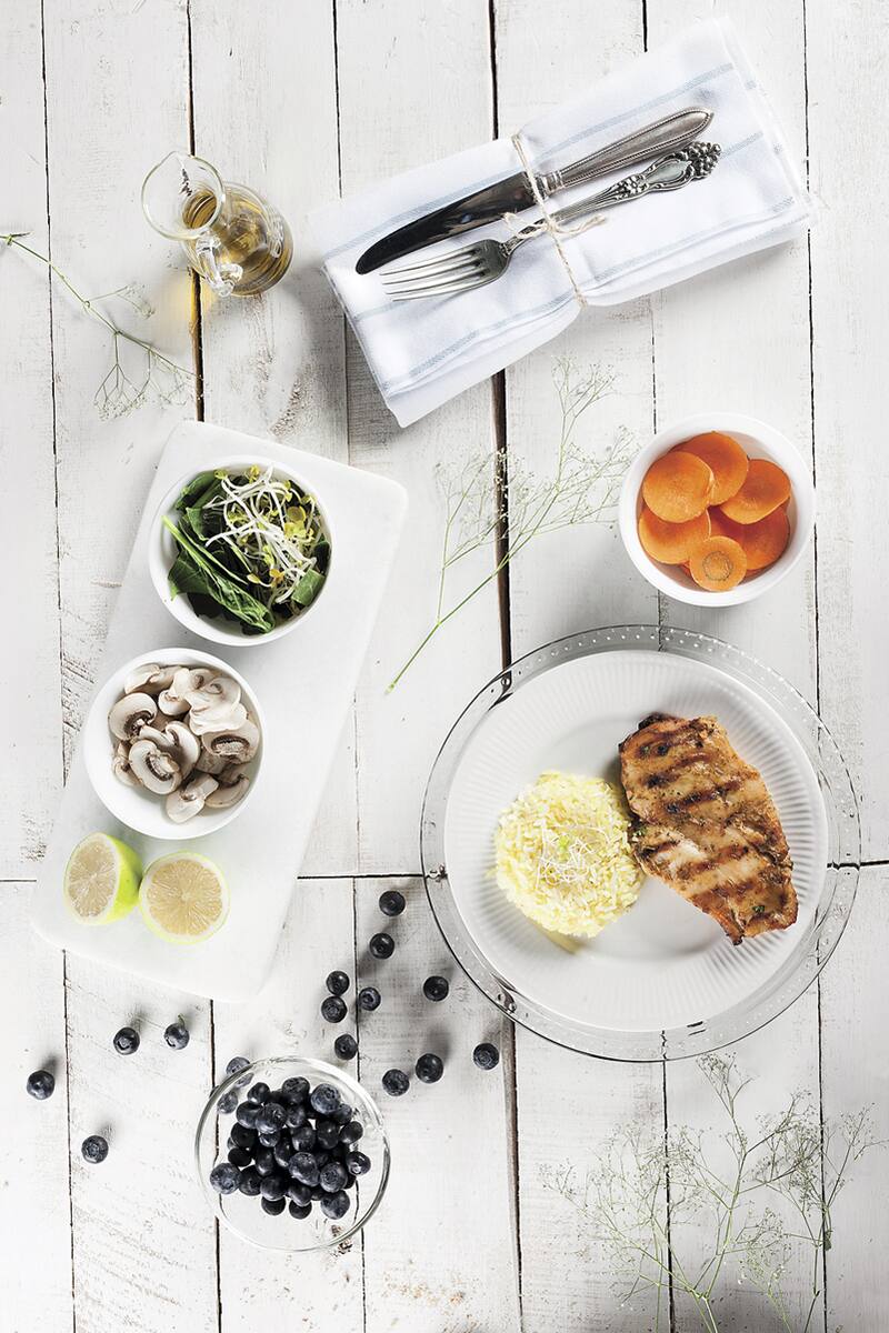 Verduras crudas o cocidas (de tres colores) con limón, aceto balsámico y aceite de oliva, con 100 o 150 g de carne sin grasa y una porción de ½ o ¾ de taza de carbohidrato (arroz, quínoa, legumbres). De postre, una fruta.