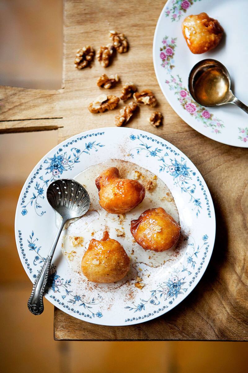 En platos individuales colocar los loukoumades y encima verter un poco de almíbar. Servir espolvoreados con nueces y canela.