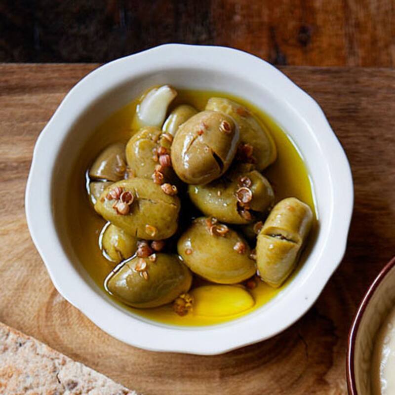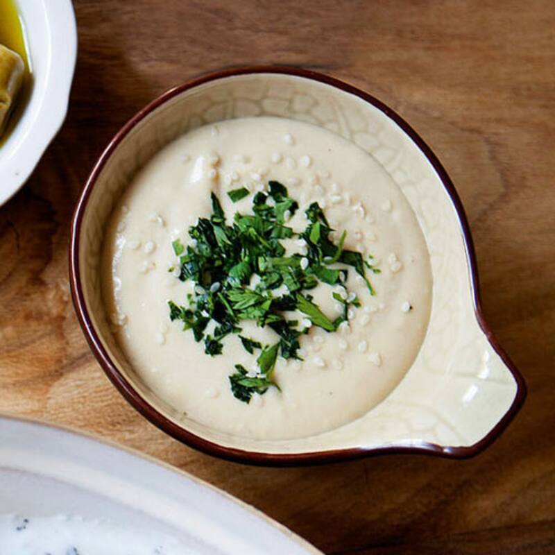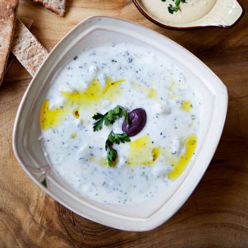 Un clásico de la mesa chipriota son las elies tsakistes –aceitunas machacadas y bien aliñadas– y las salsas para untar. Entre ellas, la tashi (foto de arriba) –pasta de sésamo con limón, agua y perejil–, y talaturi, a base de yogurt griego, hierbabuena, pepino en trozos, aceite de oliva y sal.