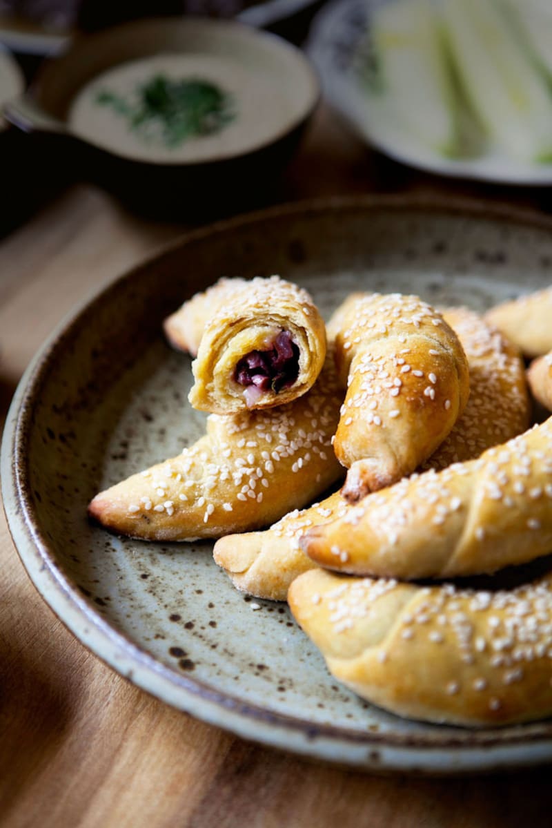 En una superficie lisa enharinada dividir la masa en 10 bolas. Uslerear 1 bola en forma de triángulo isósceles, de 25 cm de alto y 20 cm de base. En el extremo de base colocar 2 cucharaditas del relleno dejando 2 cm de masa libre y pincelar los bordes de la masa. Enrollar el triángulo de masa desde la parte más ancha a la más delgada y, luego, doblar las 2 puntas hacia el centro y presionar con un dedo para que no se salga el relleno. Doblar los extremos hacia dentro para dar la forma al eliopita (forma tipo croissant). Repetir el mismo procedimiento con el resto de masa y relleno.En una lata de horno colocar los eliopitas, pincelar con el huevo batido, espolvorear sésamo y hornear 20 minutos o hasta que estén dorados y cocidos. Retirar del horno y dejar enfriar sobre una rejilla.