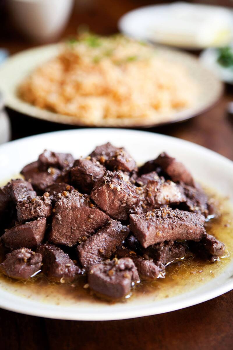 En una olla calentar el aceite a fuego alto, con cuidado añadir la carne y sellar sin dejar de revolver, 3 minutos o hasta dorar levemente, sin cocinar la carne. Sazonar las carne con sal, pizca de pimienta, resto de semillas de cilantro y agregar la marinada reservada y cocinar 2 minutos o hasta evaporar el alcohol. Incorporar el caldo y cocinar tapado a fuego muy bajo, 1 hora o hasta que la carne esté blanda.