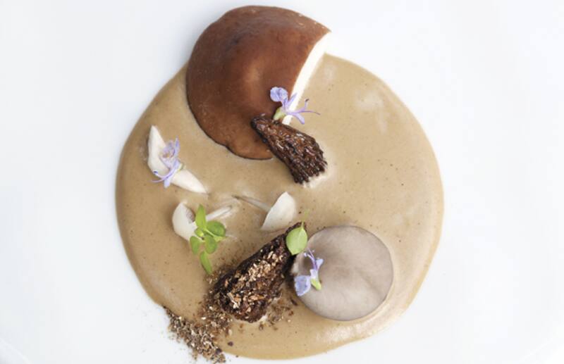 3. En un plato colocar en la base el puré de hongos reservado, encima decorar con los hongos y polvo de hongos. Servir de inmediato.