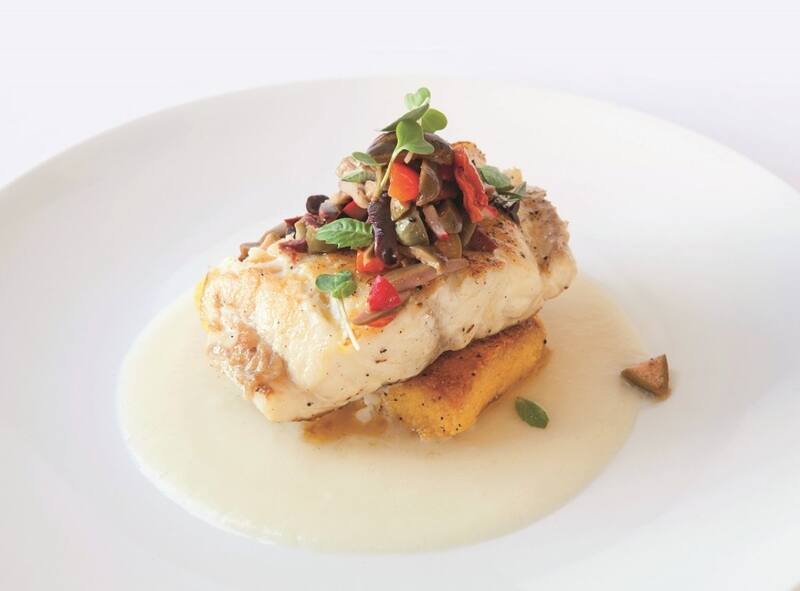 Pescado de roca con polenta sellada sobre emulsión de ajo y limón con aceitunas y verduras asadas (para 4 personas)