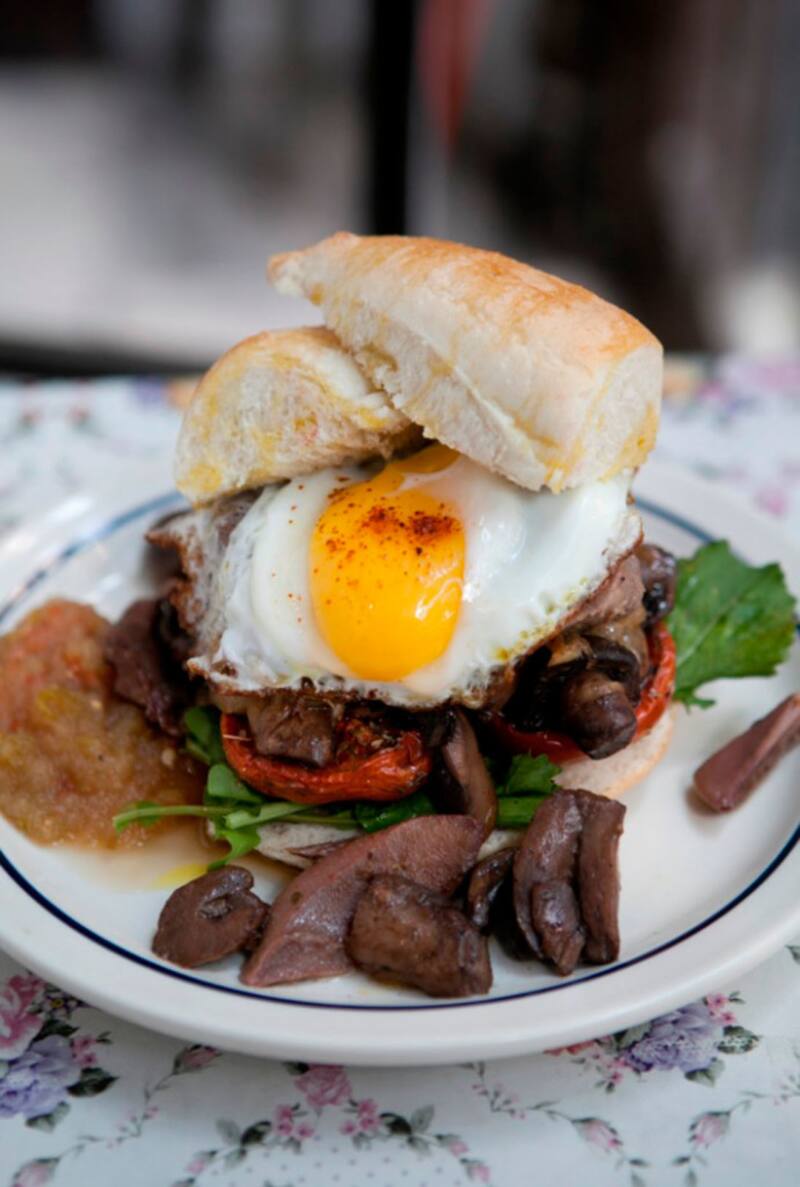 5. En las mitades de pan distribuir la cebolla, láminas de lengua, champiñones, tomates reservados, mayonesa, huevo y espolvorear con merkén. Luego tapar con las otras mitades de pan. Servir de inmediato decorado con ají y perejil.