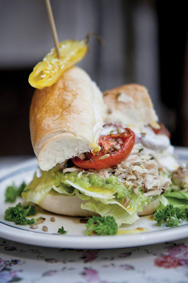 3. En las mitades de pan distribuir la mezcla de sierra, encima la mezcla de apio-palta y hojas de rúcula. Luego tapar con las otras mitades de pan y servir de inmediato acompañados de ají.