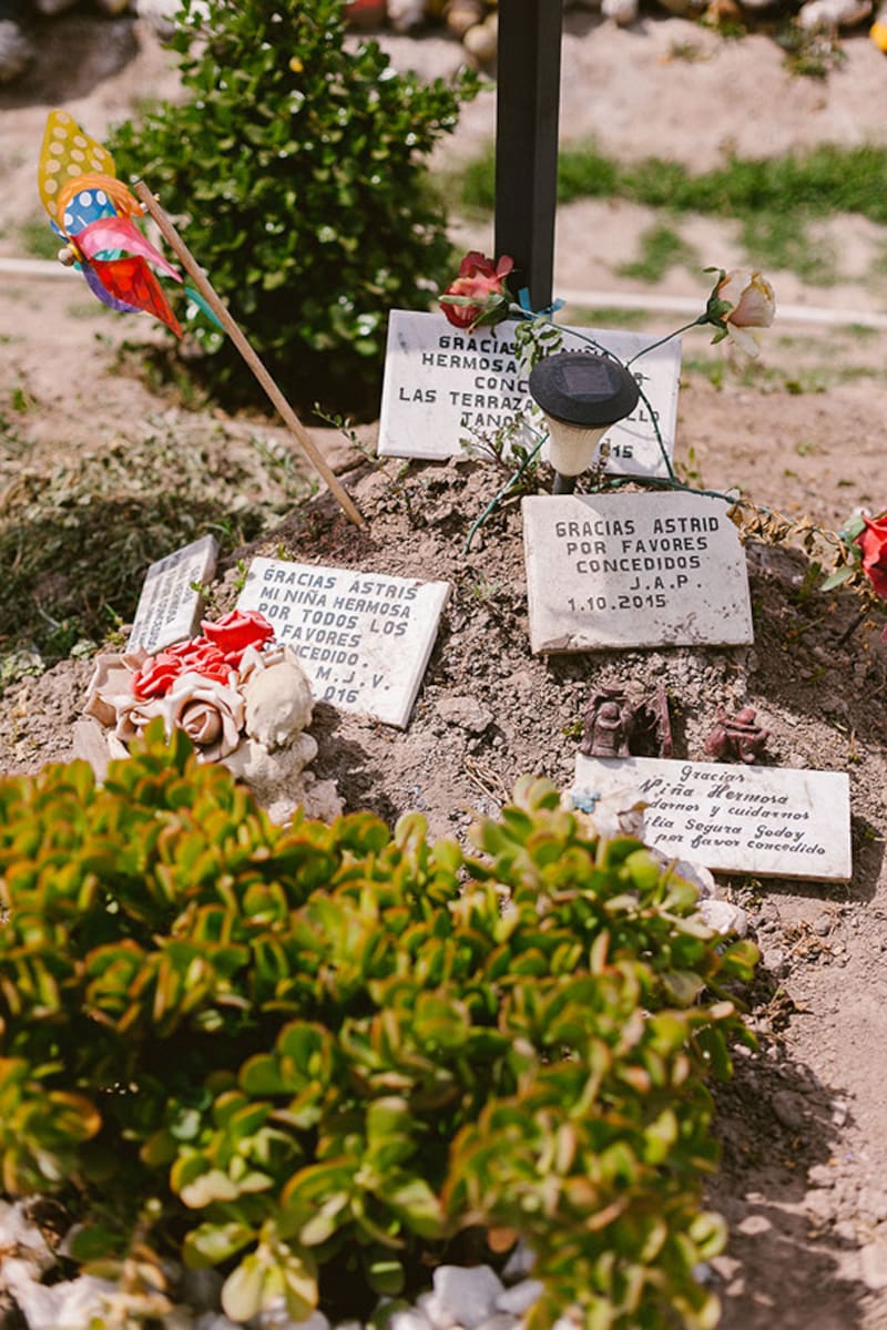 La animita cuenta con un pequeño galpón donde la gente cuelga sus ofrendas. Entre ellas, hay un test de embarazo envuelto en una bolsa de género rosada y una ecografía. Todo indica que alguien le pidió a La niña hermosa quedar embarazada, y se cumplió. María Baeza (61) vino junto a su marido por una razón similar. En sus manos llevan el peluche que la pareja de su hija mayor le regaló cuando eran pololos. "Nosotros venimos con una misión: queremos pedirle que mi hija y su esposo puedan tener hijos. Ellos están en un tratamiento que se termina en una semana, y elegimos traerle este perrito porque es muy importante para los dos", dice. Hace 10 años que pasan todos los martes a visitarla, sin embargo, esta es solo la segunda vez que le piden algo. La primera fue que su hija menor pasara su examen de grado. "Mañana jura como abogado en la Corte Suprema. Encontramos simbólico venir para agradecer ese favor, y pedir otro". María se emociona al visitar el lugar, porque los ojos de Astrid le recuerdan mucho a su hija mayor. "Siempre la he visto en ella. Cuando estoy cerca se me paran los pelos, siento muchas cosas. Me gusta venir a verla y cuidar este espacio, pero prefiero no pedirle cosas para dejarla tranquila. Siento que su alma está acá".