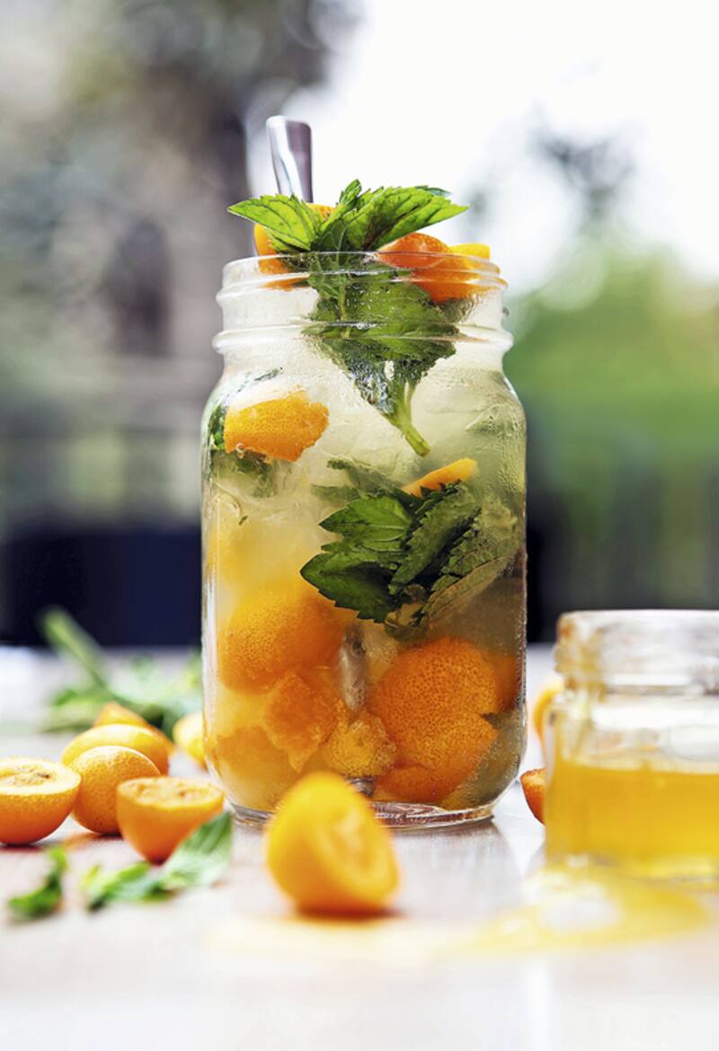 1. En un vaso alto colocar los quinotos y miel de palma, machacar hasta que estén bien mezclados con la miel, agregar la hierbabuena o menta, llenar con hielo, verter el agua con gas. Decorar con quinotos y hierbas.