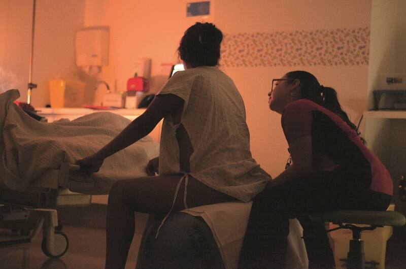 La mujer es boliviana, tiene 20 años y es usuaria de Fonasa. Lleva cuatro horas en trabajo de parto. Está acompañada por su pareja y una matrona que le ofrece todo el abanico de posibilidades que brindan las Salas de Atención Integral del Parto: aromaterapia, música y balón kinésico. Sentarse en él ayuda a que la guagua se encaje y el parto se acelere naturalmente.[/caption]