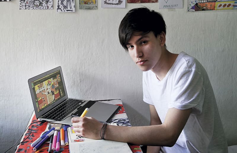 Cuando no está en el colegio, Sebastián Briceño (18) está en el computador ilustrando, escribiendo y organizando las próximas ediciones de su webzine ilustrado Tangerzine, un híbrido entre blog y revista digital que en cada número recibe 2.000 visitas y que se ha convertido en un referente en este nuevo formato. Todo empezó cuando tenía 11 años, conoció el Photoshop y alucinó: se convirtió en su juguete favorito e incluso ir al colegio, algo que detesta "desde siempre", perdió todo sentido para él. Esa fue la puerta de entrada de su gran pasión hasta hoy: la ilustración digital. Paralelo a esa habilidad, que lo llevó a publicar sus dibujos en diversas páginas nacionales, en 2013 creó el blog de música, arte y cultura pop Oldiegrant. Después de dos años de funcionamiento, cuando ya estaba aburrido del formato, Luis Mella –un amigo que conoció por internet, estudia Informática y sabe de programación– le propuso hacer un webzine. Hoy ambos son los líderes de un grupo de alrededor de 30 personas, casi todas mayores que él, que ilustran y escriben por amor al arte, sin créditos ni paga. Han lanzado tres ediciones desde mayo –que incluyen reportajes, entrevistas y columnas–, cada una con tema especial: la primera dedicada al programa MasterChef, la segunda un homenaje al primer celular (el Nokia 5200), y la última sobre historias paranormales. "Quiero salir del colegio. Ya no aguanto más. El próximo año quiero estudiar ilustración, algún taller corto para empezar altiro a hacer las cosas que me gustan", dice Briceño.