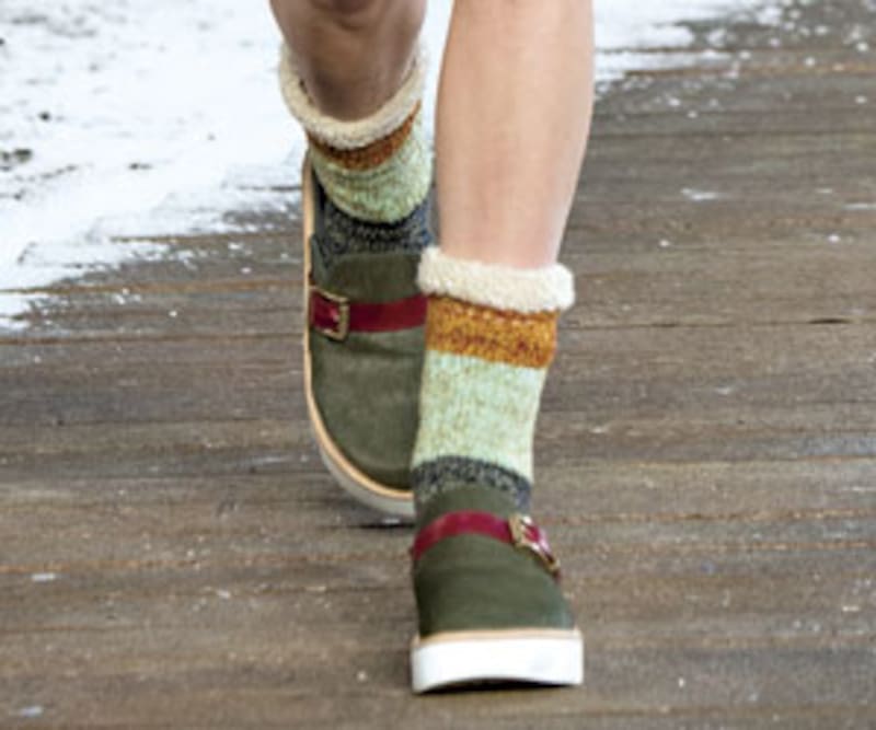 la gracia es que los zuecos, con terminaciones en piel sintética y suelas de goma blancas, se combinaron con llamativos calcetines, estampados en bloques de colores.