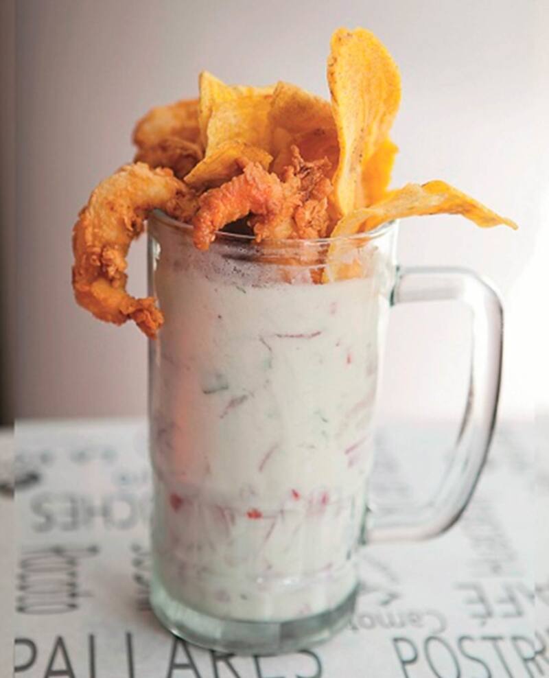 De reineta en trozos, con limón de Pica, cebolla morada, cilantro y abundante leche de tigre que llega servido en un vaso schopero con tres chicharrones de calamar y plátanos fritos ($ 5.500).