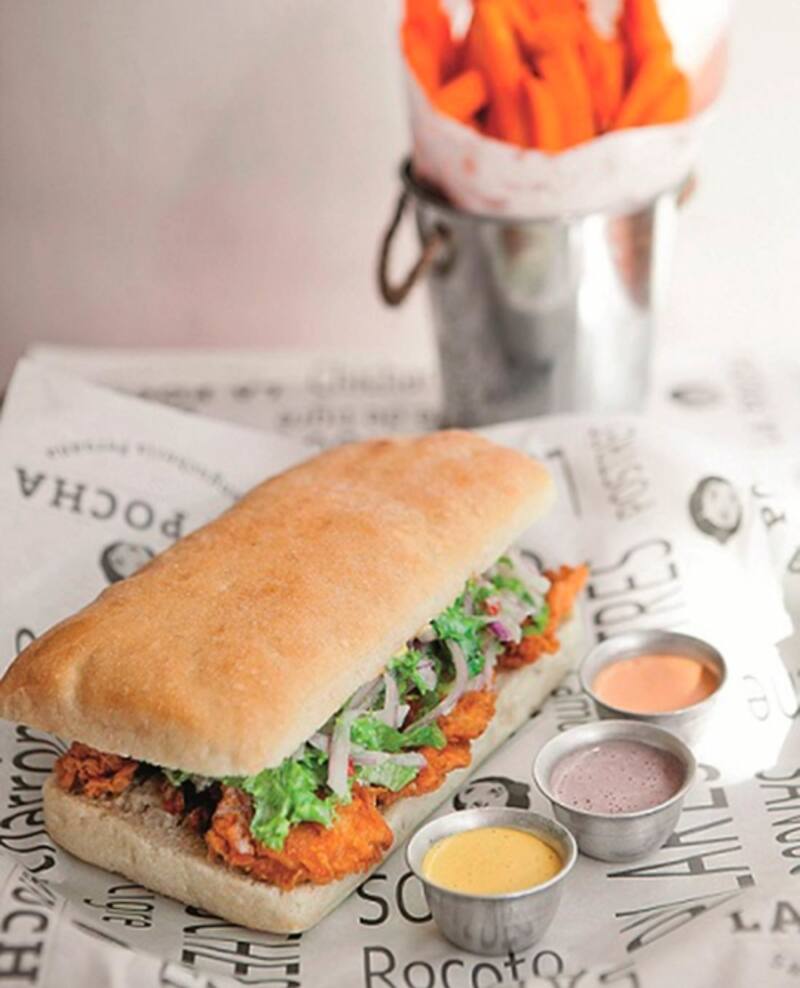 Hecho con una crocante pero jugosa reineta apanada y frita, sarza criolla, cilantro, lechuga y rocoto (el comensal decide el grado de picor). Lo preparan en pan ciabatta y antes de servirlo le echan un poco de leche de tigre para darle el sabor acebichado. Espectacular ($ 5.200).