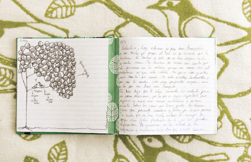 Una tía de Valentina le compró un cuaderno verde que en la carátula tiene un pájaro. Allí le escribían todos cuando iban a visitarla.