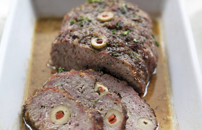 1. En un bol colocar el pan rallado, verter la leche y remojar 10 minutos. En otro bol grande colocar las carnes molidas, cebolla, huevo, panceta, parmesano, perejil, aceitunas y pan remojado; sazonar con sal y pimienta. Mezclar hasta que esté homogénea. Con las manos húmedas formar un cilindro con la carne.