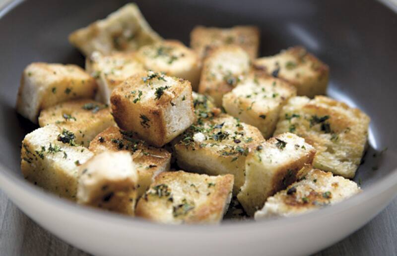 4 rebanadas de pan de molde, marraqueta u otro, sin cortezas y en cubos de 2 cm