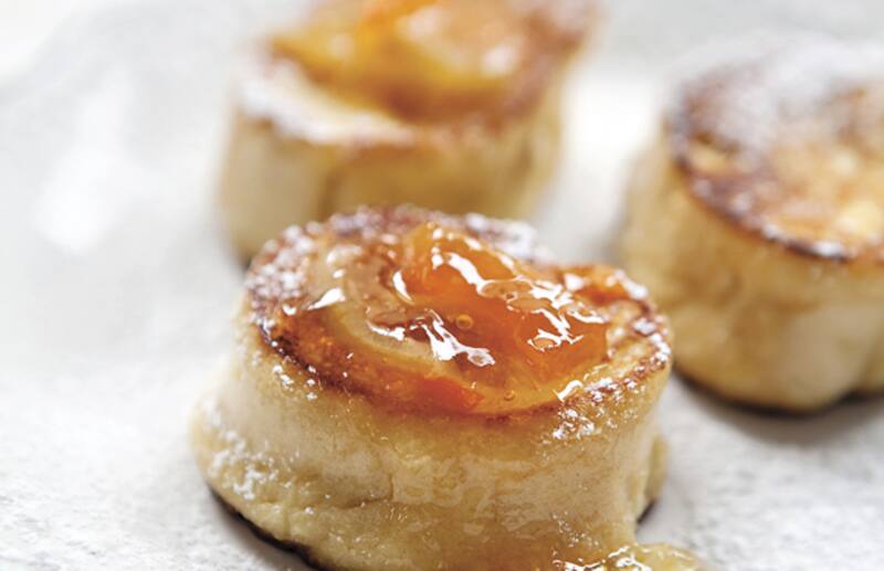 3. Antes de servir, en un sartén calentar la mantequilla y aceite a fuego medio, agregar el pan remojado y cocinar hasta dorar por ambos lados. Reducir el calor a fuego bajo y continuar la cocción un par de minutos más, dando vuelta las tostadas hasta que estén cocidas por dentro (van a subir un poco). Servir de inmediato, espolvoreadas con azúcar flor y mermelada de naranja.