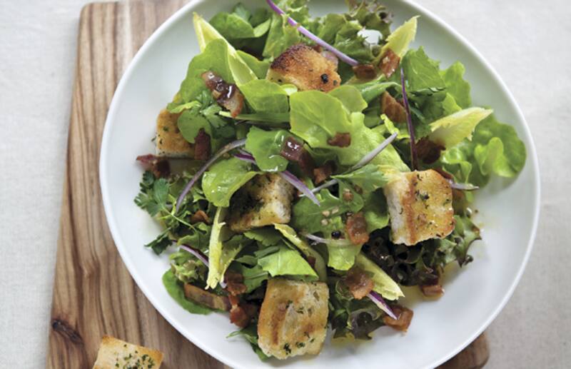 Ensalada de hojas verdes con croûtones y vinagreta tibia de tocino (para 4 personas)