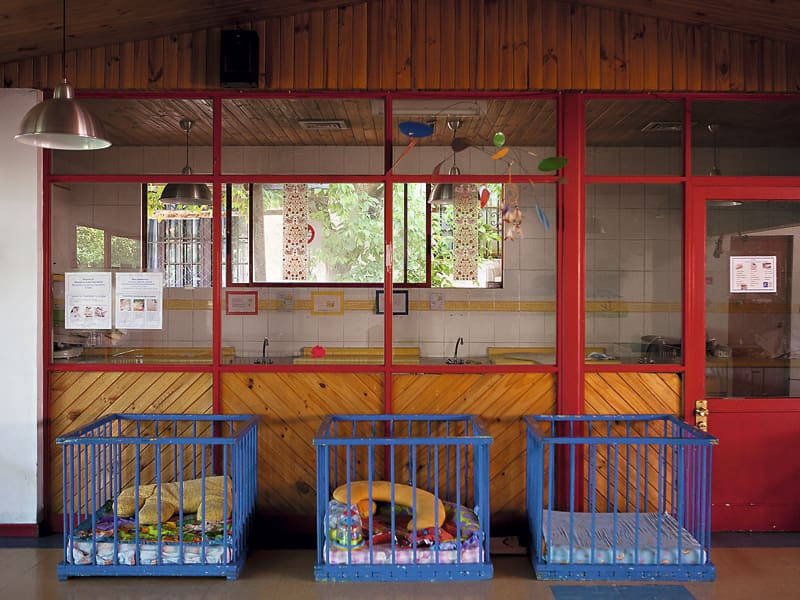 La residencia tiene una sala cuna decorada con un mural del arca de Noé con ballenas y un móvil de payasos. En la puerta están los horarios de las actividades de cada jornada: a las 9 de la mañana estimulación; a las 11:40 juego libre; a las 12:30 mudas y a las 13:00 horas viene la siesta. La puerta de salida tiene algunos recordatorios para las madres: "Mamá despídete antes de salir", "¿Me dejaste mi muda, mis pañales, mi mamadera?", "Chao, mamá, te quiero. Nos vemos".