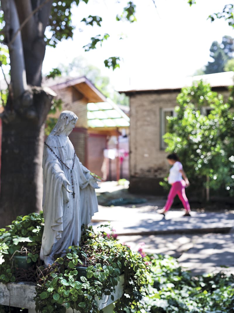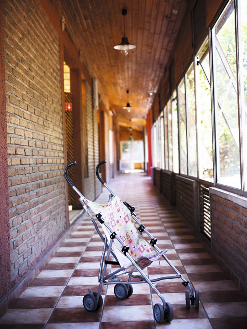 Una joven con varios meses de embarazo cruza el patio con zancadas apuradas. En una de las murallas del jardín trasero se asoma un tendedero lleno de piluchos, pañales y una jardinera azul que se mecen con el viento. Al costado están las casas de acogida, con cuatro habitaciones cada una, dos baños, un mudador y un comedor. En el pasillo, una pequeña de pelo crespo descansa sentada en su coche y agita los brazos, mientras balbucea para llamar la atención de su joven mamá.