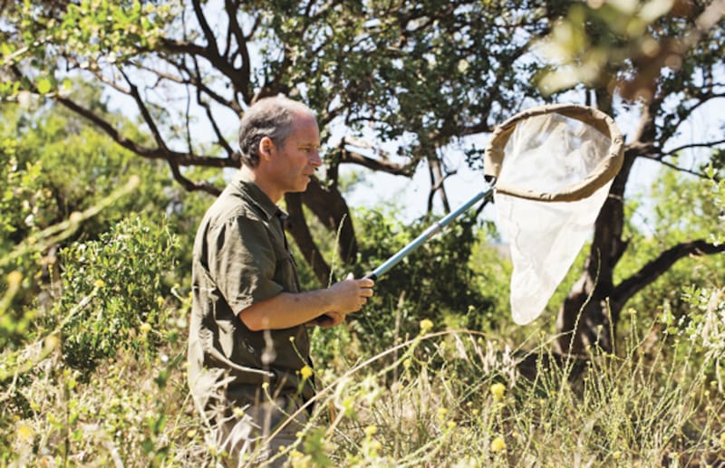 El entomólogo Alfredo Ugarte busca atrapar un ejemplar de Phoebis sennae amphitrite, una mariposa color amarillo limón que pone sus huevos en un arbusto chileno, el quebracho.
