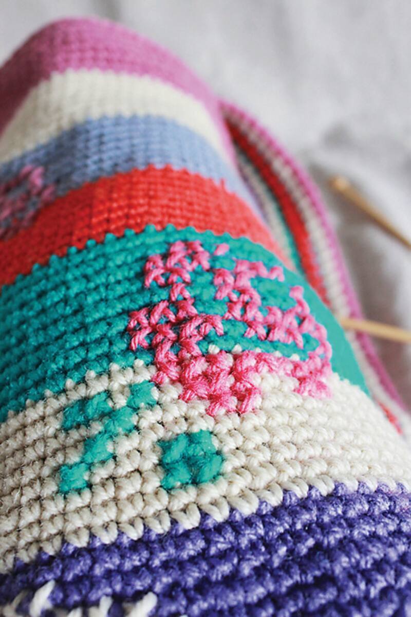 10. Para no cortar la lana cada vez que tengas que cambiar de color, teje con las hebras del color que no estás ocupando, por atrás.
