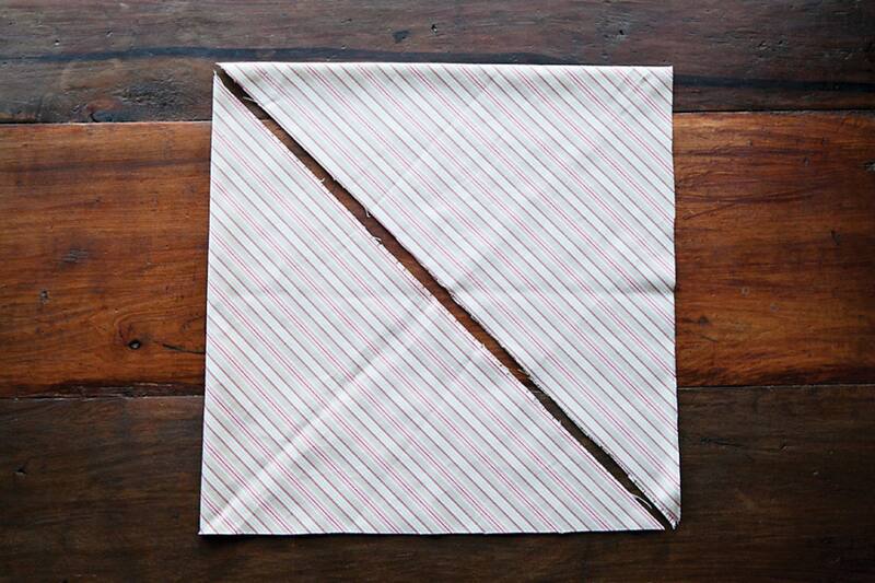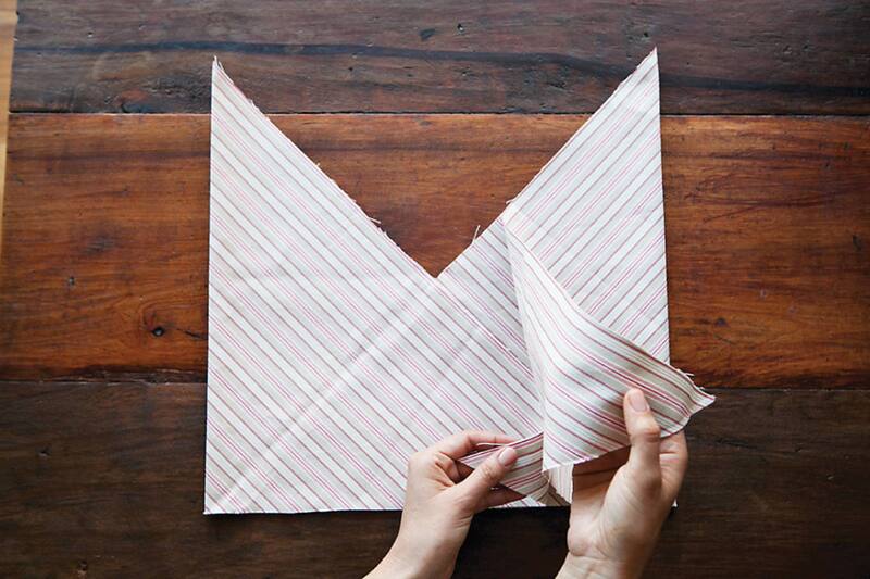 1.Doblar la tela para obtener 2 triángulos iguales. Cortarla y doblarla nuevamente .