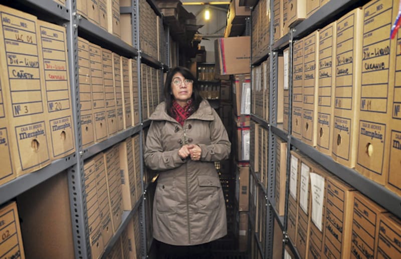 La archivera María Eugenia Queupemil en la pieza donde están las 2.918 carpetas.