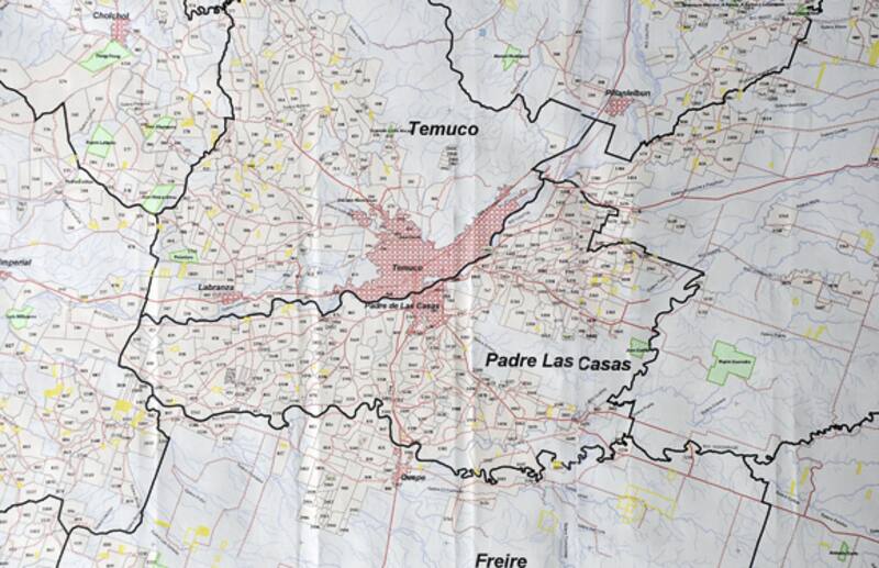 Todo lo que rodea Temuco es o fue territorio mapuche según los títulos de merced. En el archivo tienen pegado en la pared un ejemplar actual de la Carta Bolognia; un mapa con todos los títulos asignados entre 1866 y 1929. Y, según ese plano, la periferia de Temuco es tierra mapuche.